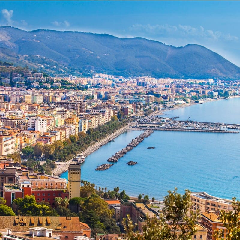 Salerno è una splendida città campana che, con i suoi colori, si abbina perfettamente all'azzurro del mare su cui si affaccia. La storia a Salerno si respira nell’aria: una tappa imperdibile per scoprirla è la splendida Cattedrale di San Matteo caratterizzata da un’architettura romana e riccamente decorata da affreschi. Salerno è famosa per essere la porta di accesso della famosissima Costiera Amalfitana , ma è molto di più, con il suo centro storico medievale perfettamente conservato, uno splendido lungomare e una cucina ricca di sapori. Proprio qui, infatti, nasce la squisita mozzarella di bufala , talmente buona che va assaporata in purezza, senza olio e senza sale! Salerno è una città che ti rapirà il cuore sia per la sua autentica bellezza che per la sua cordiale ospitalità facendoti sentire subito a casa.