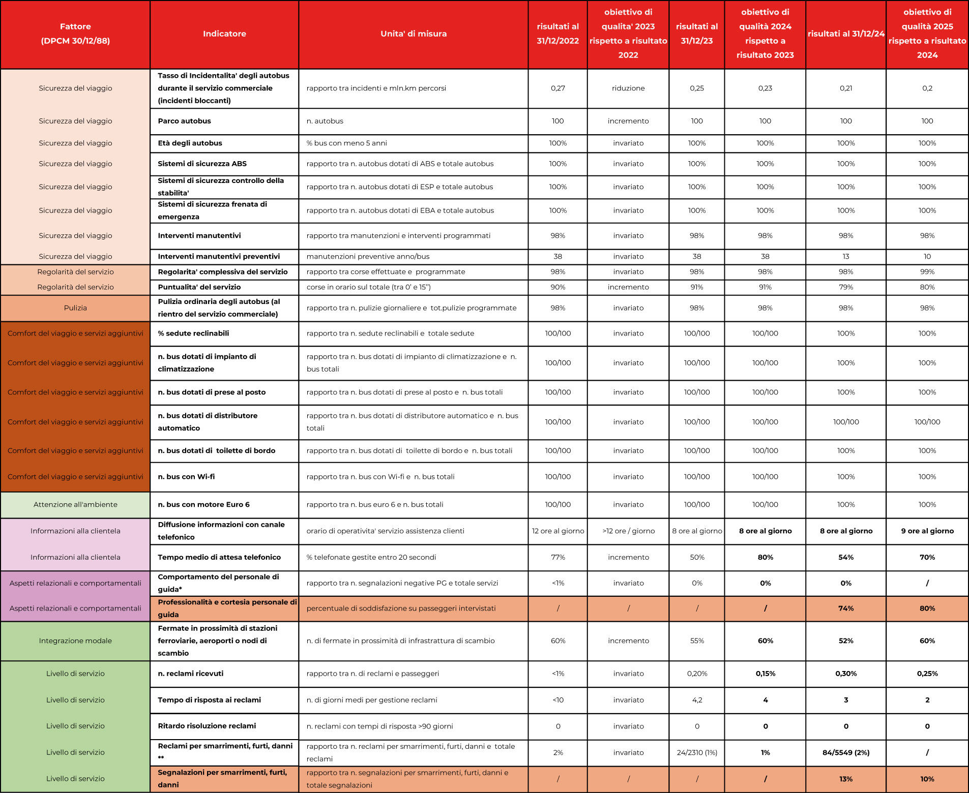 * l'indicatore, a far data dal 01/01/25 è sostituito con "professionalità e cortesia personale di guida" in coerenza con le modifiche dei sistemi di rilevazione/monitoraggio interni